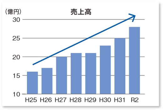平成27年度に売上高20億円を突破してからは年々売り上げが伸びており、令和2年度は売上高28億円と、30億円達成も目前です。 50年以上の事業実績と信頼により、官公庁や地方自治体からの案件が売上高の9割を占めているため、これらの安定した受注基盤を強みに今後も右肩上がりの成長が期待できます。