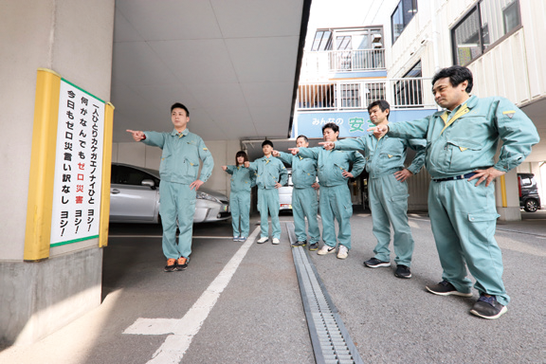 安全に作業するための注意事項を全員で指差確認し、その日の作業の流れや天候、現場の注意点を班長から班員に伝達した後、作業を開始します。